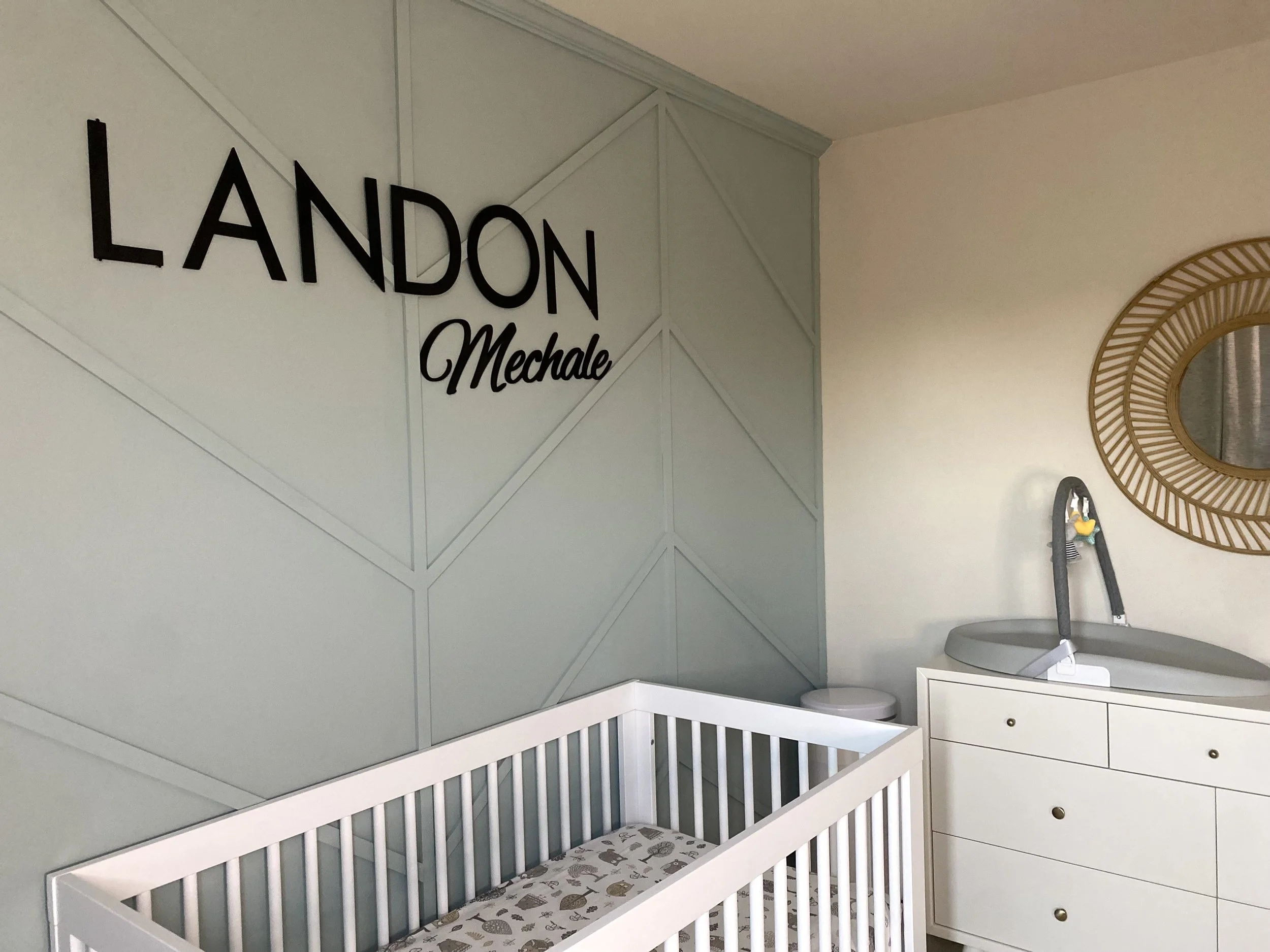 The process of creating a design is always unique to each client. There are key features to an “Everly & Monet” design, but my style is their style. My strength is the ability to morph into who my clients are, thus understanding their needs are crucial. Elleni knew she wanted some dramatic elements in the room. She wanted to create a geometric paneled wall to give the room some depth. We highlight the baby’s name in carved 3D wood lettering. It was important for Elleni to incorporate her Ethiopian culture and heritage into the space. We used family heirloom Ethiopian crosses and the Amharic alphabet to add a true authenticity to the room. We were able to do that with family heirloom Ethiopian Crosses and an Amharic Fidel alphabet.