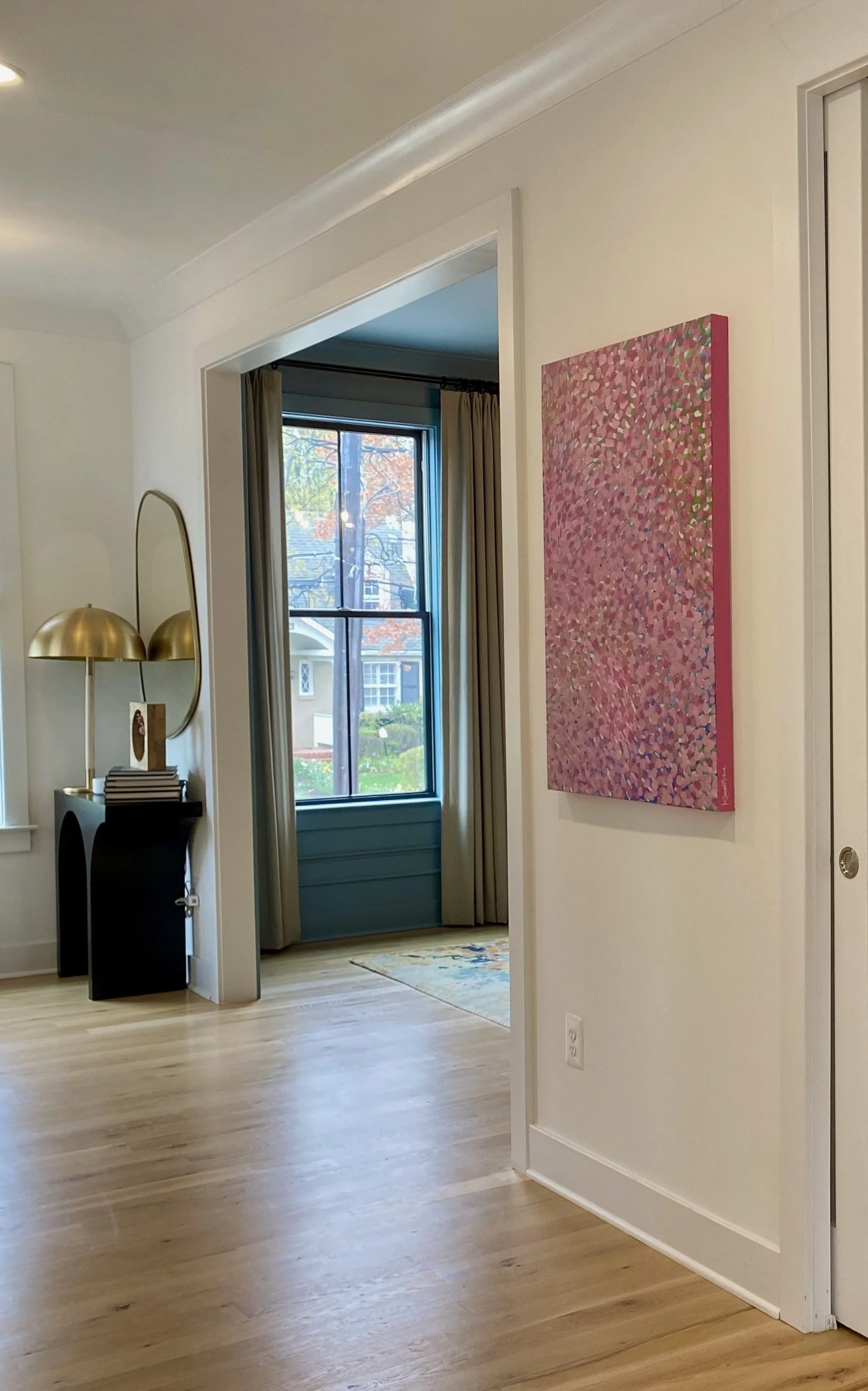 This foyer is where the joyful art of Kamael Mishra came to be. When I was in her finely decorated home during my art tour. Her abstract works really stood out. Her bold colors evoked a moodiness I just love. I knew that they would fit well in the design plan. We chose 3 of her pieces for the hall and office. They really speak to each other in a wonderful way and set the tone for the home.